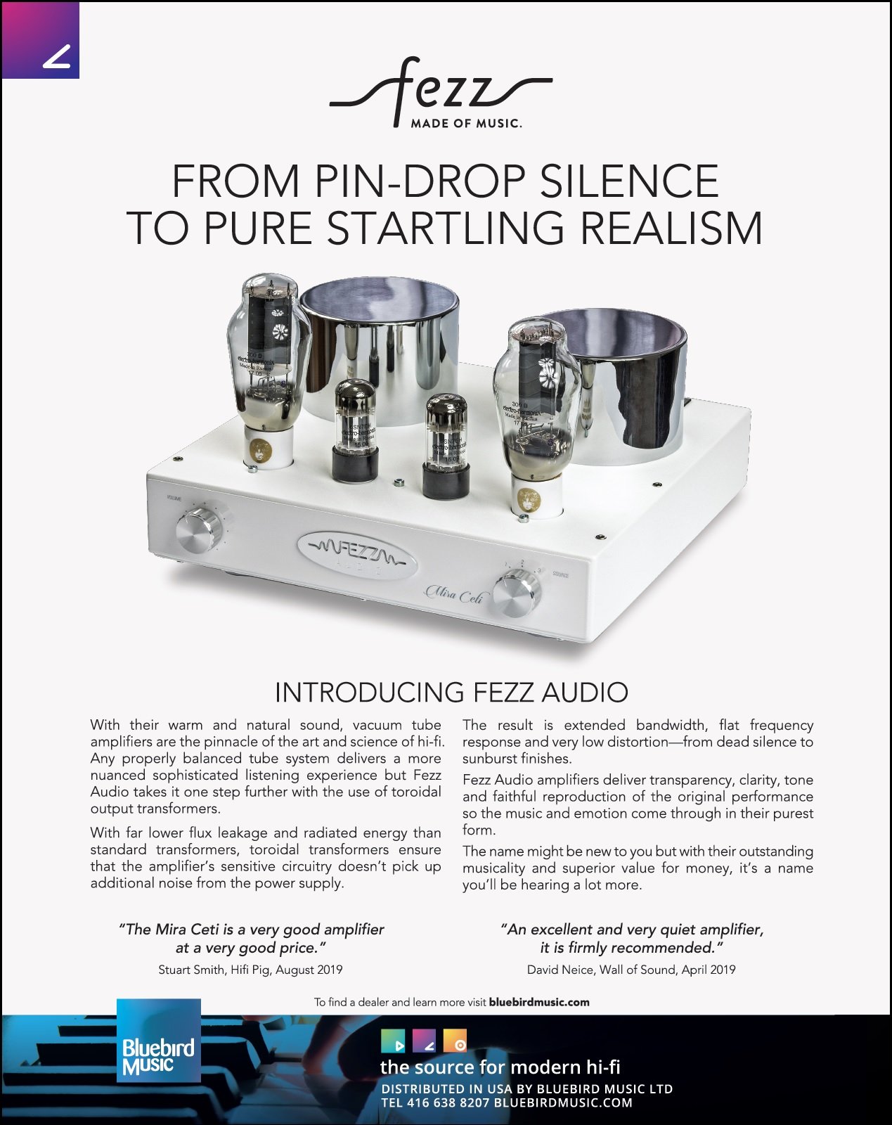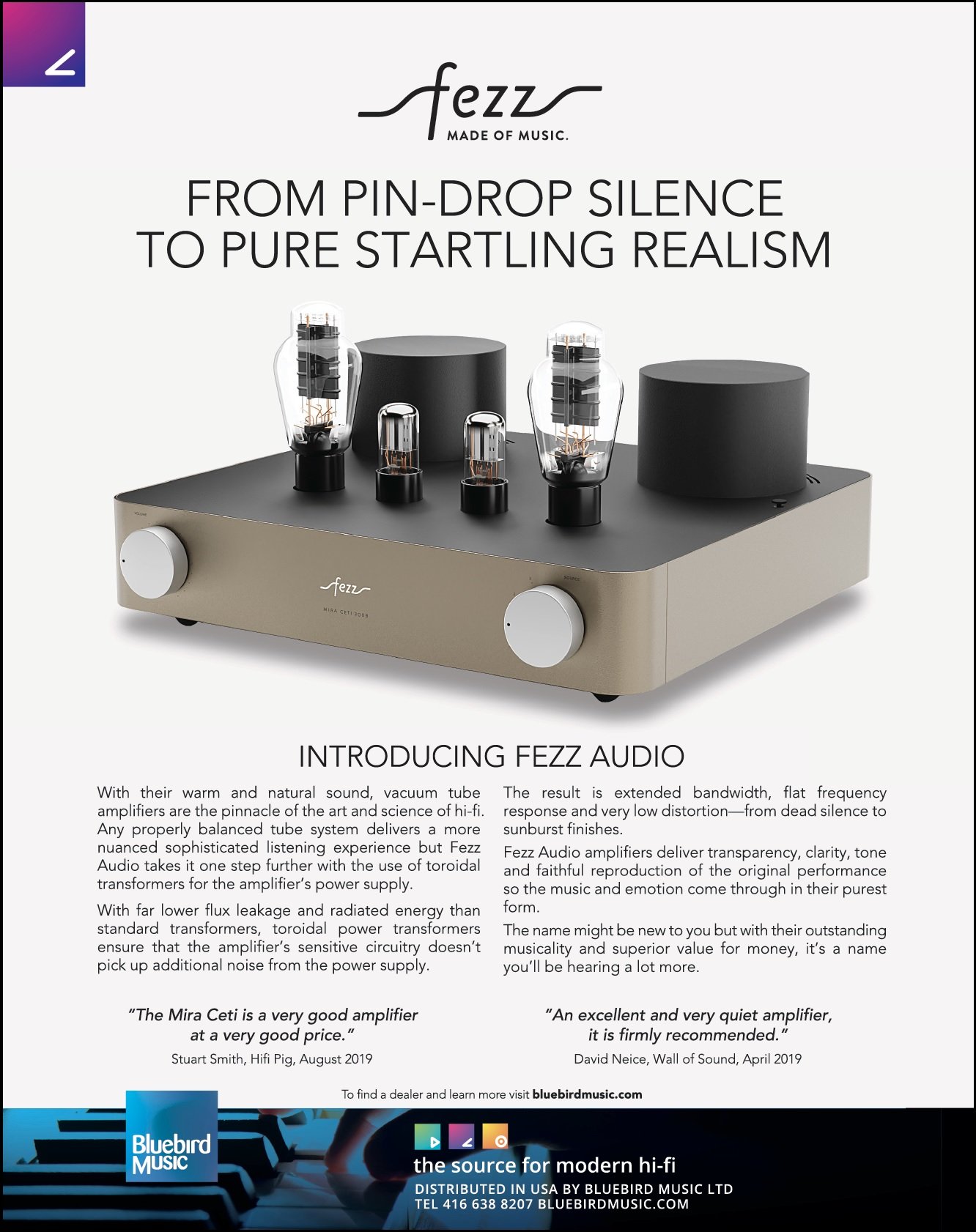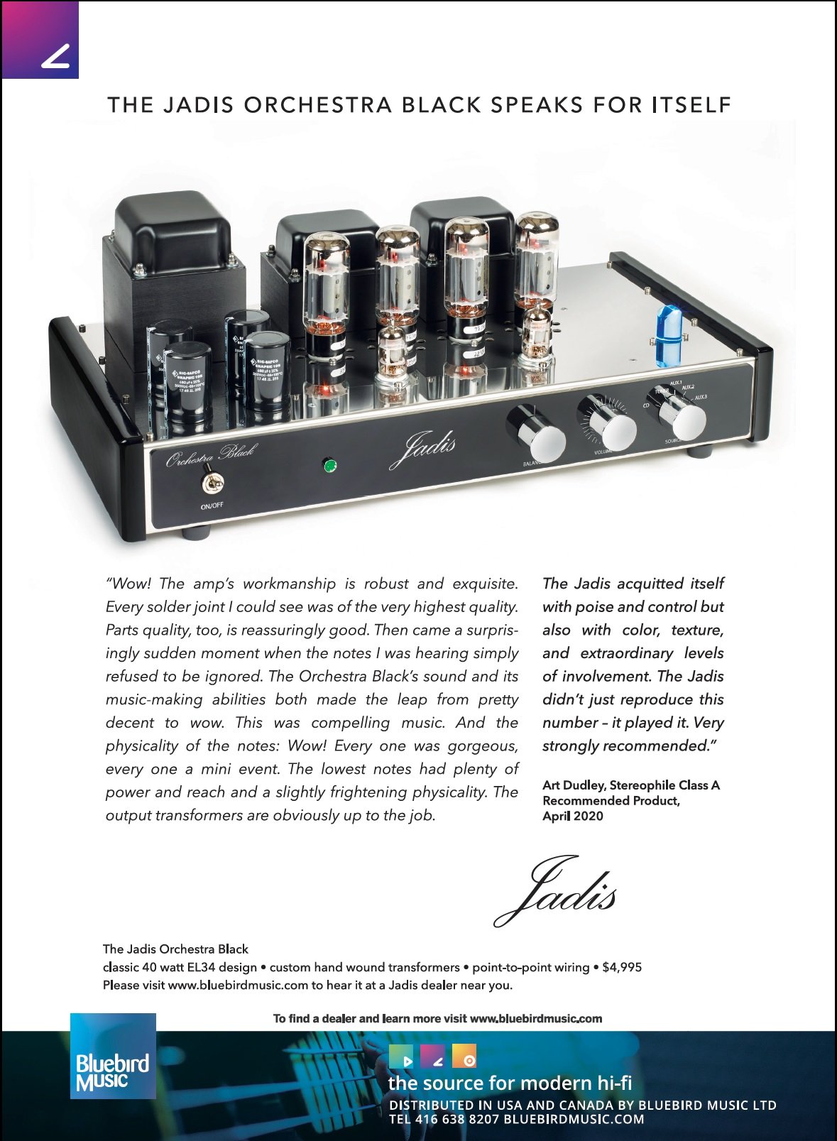 Welcome to Bluebird Music. Bluebird is an importer and distributor of high quality two channel audio products. Our products are available through our network of highly skilled Authorized Dealers throughout USA and Canada. All sales and service is provided through our dealers and we do not sell directly to the public. Please enjoy browsing through our collection of exciting, modern, world-class brands and when you are ready click Find A Dealer and we will be delighted to refer you to one of our experts for assistance. Read more...